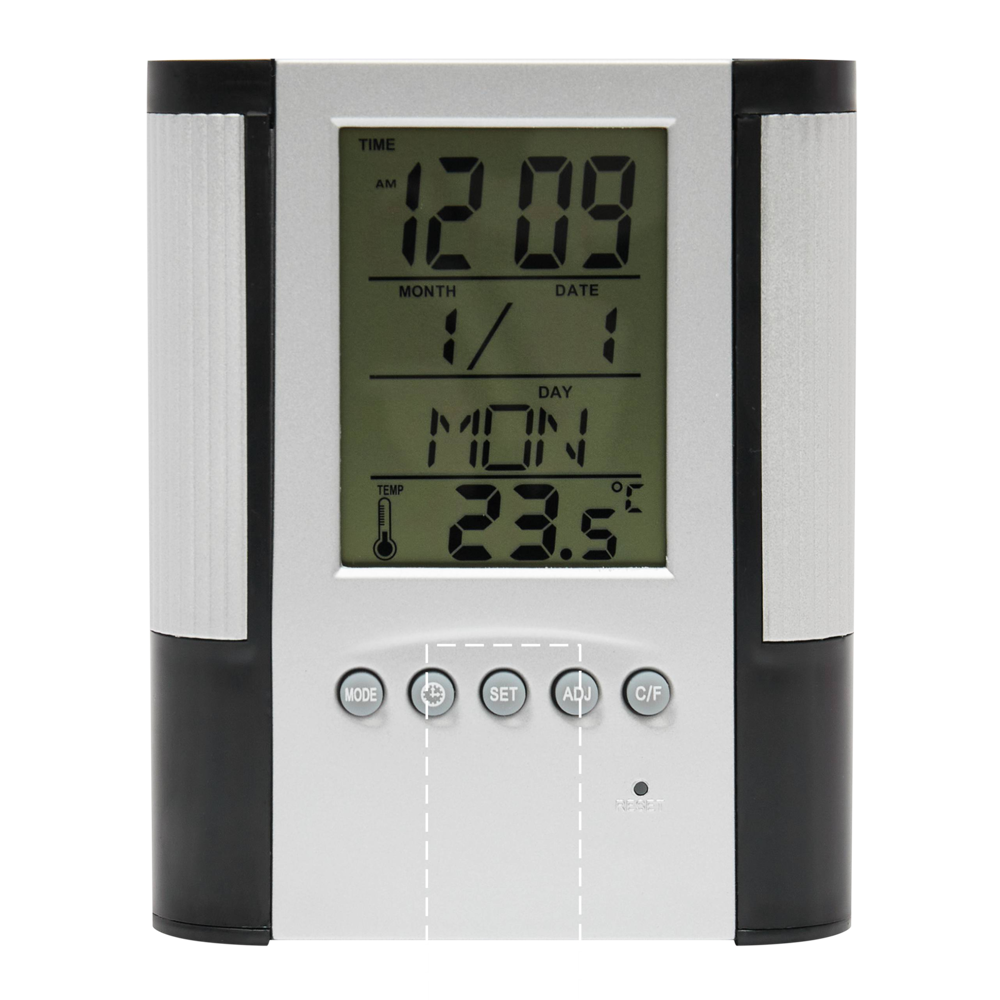 LCD-Wecker BUTLER: mit integriertem Stiftehalter, Datumsanzeige und Thermometer, batteriebetrieben (1x CR2025 Knopfzellen enthalten), in Box