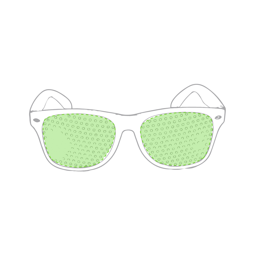 Brille mit originellem Design - speziell entworfen für den Vollfarb-Digitaldruck. Mit Rahmen in fröhlichen Farben und perforierten Gläsern.