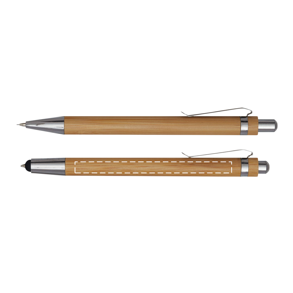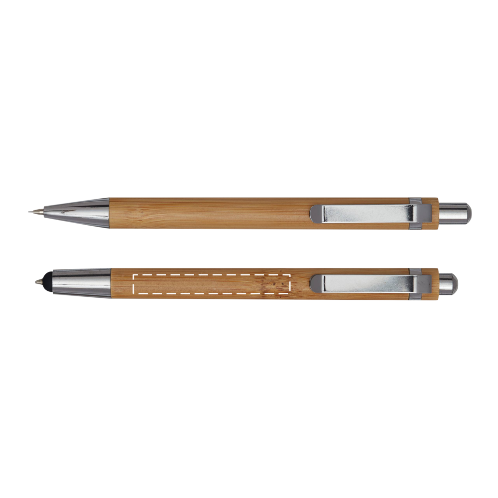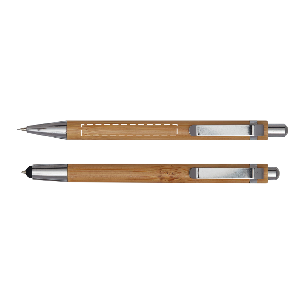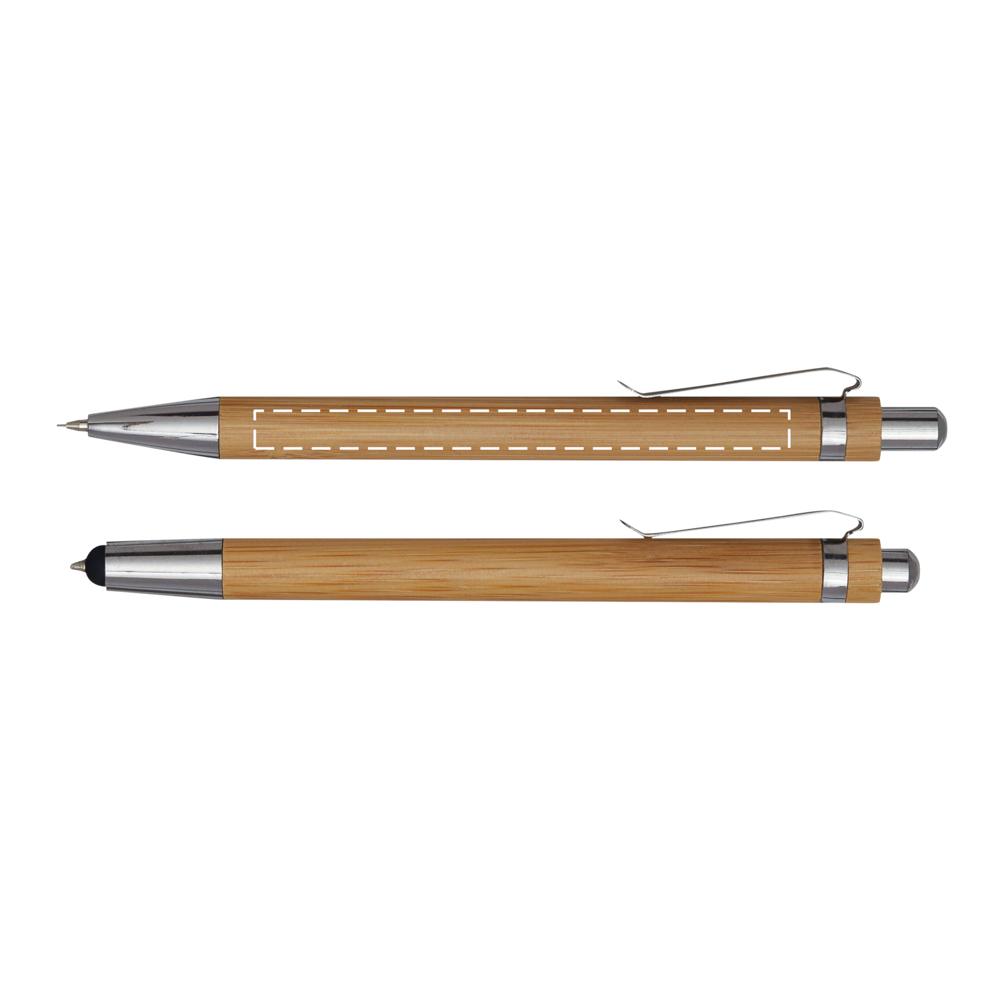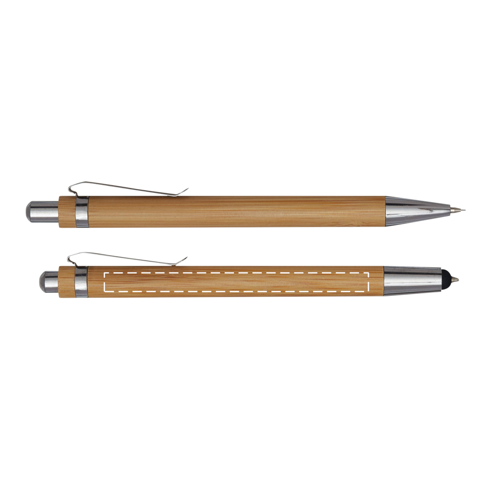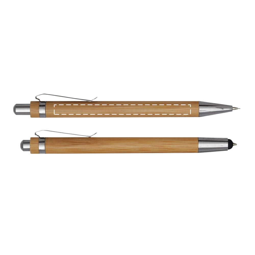 Schreibset DOUBLE BAMBOO, 2-teilig: bestehend aus Kugelschreiber mit Druckmechanismus und Touchscreen-Spitze (blauschreibend) sowie Druckbleistift, beide Schreibgeräte mit elegantem Bambus-Schaft, in Box im Bambus-Design