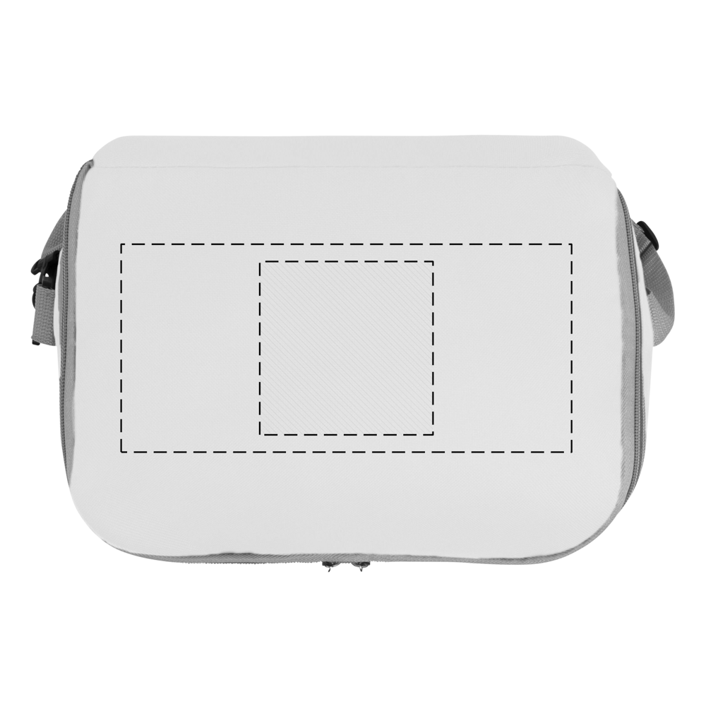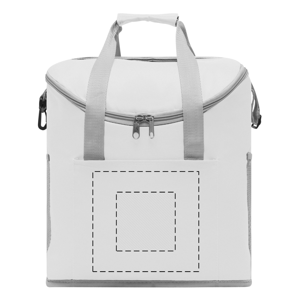 Kühltasche FROSTY: 1 Einsteckfach auf der Front, mit isoliertem Reißverschluss-Hauptfach, 2 seitliche Netz-Einsteckfächer, verstärkte Tragegriffe, verstell- und abnehmbarer Schultergurt – ideal für Picknick, Grillen und auf Reisen