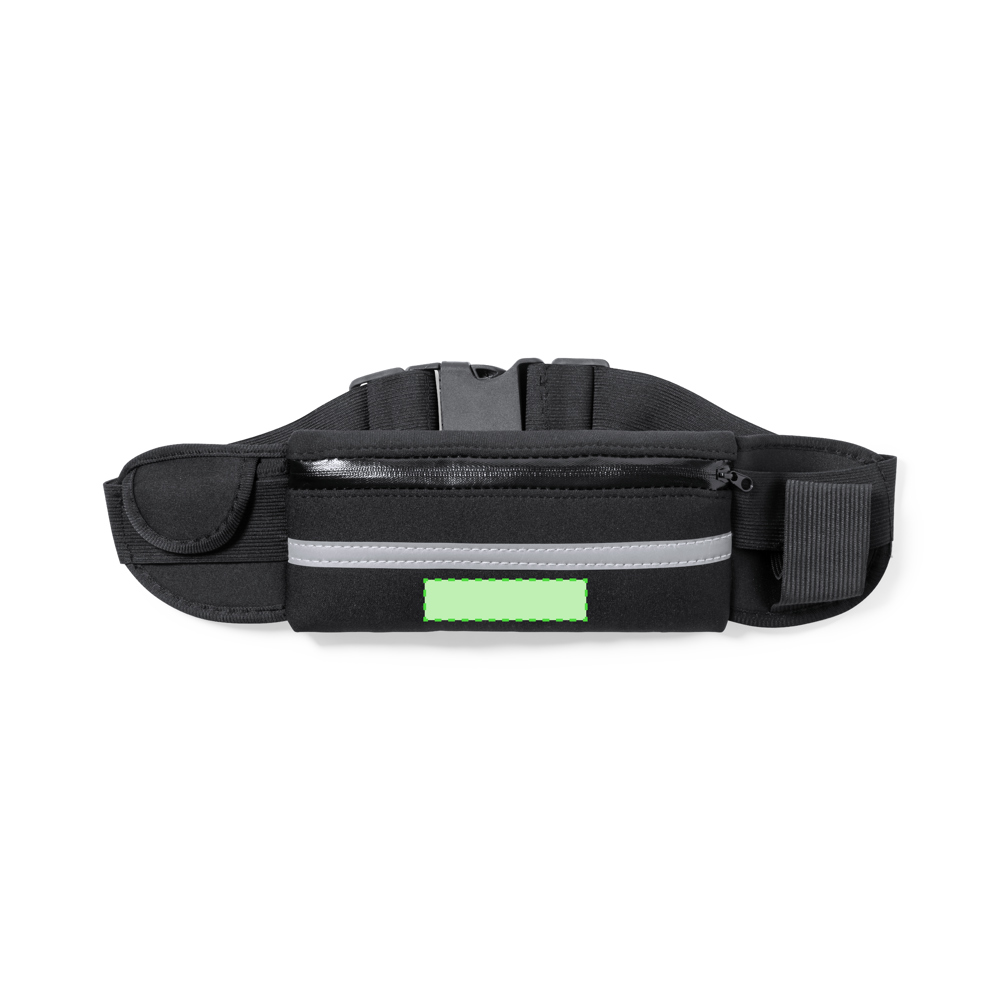 Hochwertige Bauchtasche aus strapazierfähigem Softshell (Neopren), mit reflektierendem Streifen. Hauptfach mit Reißverschluss, elastischem Flaschenhalter und Tasche für Schlüssel und andere Kleinigkeiten. Mit Schnallenverschluss und verstellbarem Riemen, speziell für Sport- und Freizeitaktivitäten konzipiert.