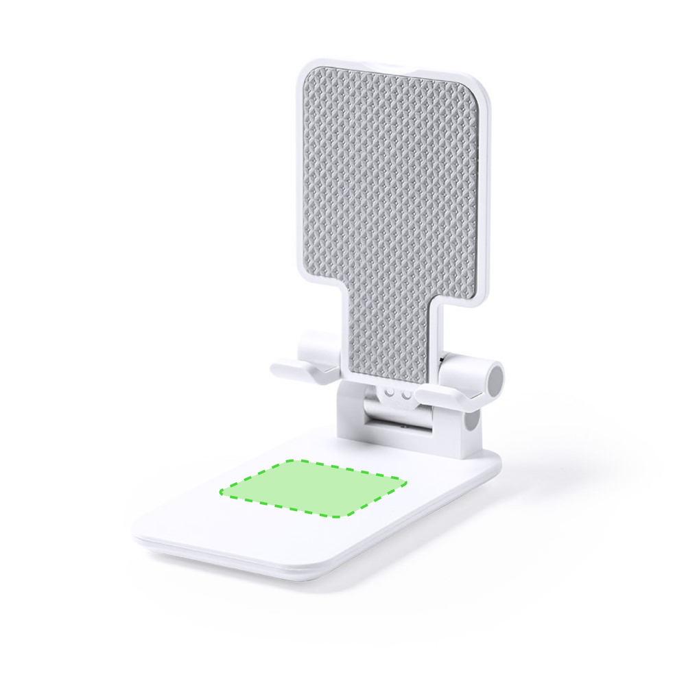 Faltbarer Ständer für Smartphones und Tablets. Höhenverstellbar, inklusive rutschfesten Gummischutz an der Basis und Stütze. In schlichtem Weiß und mit großer Beschriftungsfläche, besonders geeignet für den Tampondruck. Präsentiert in einer attraktiven Designbox.