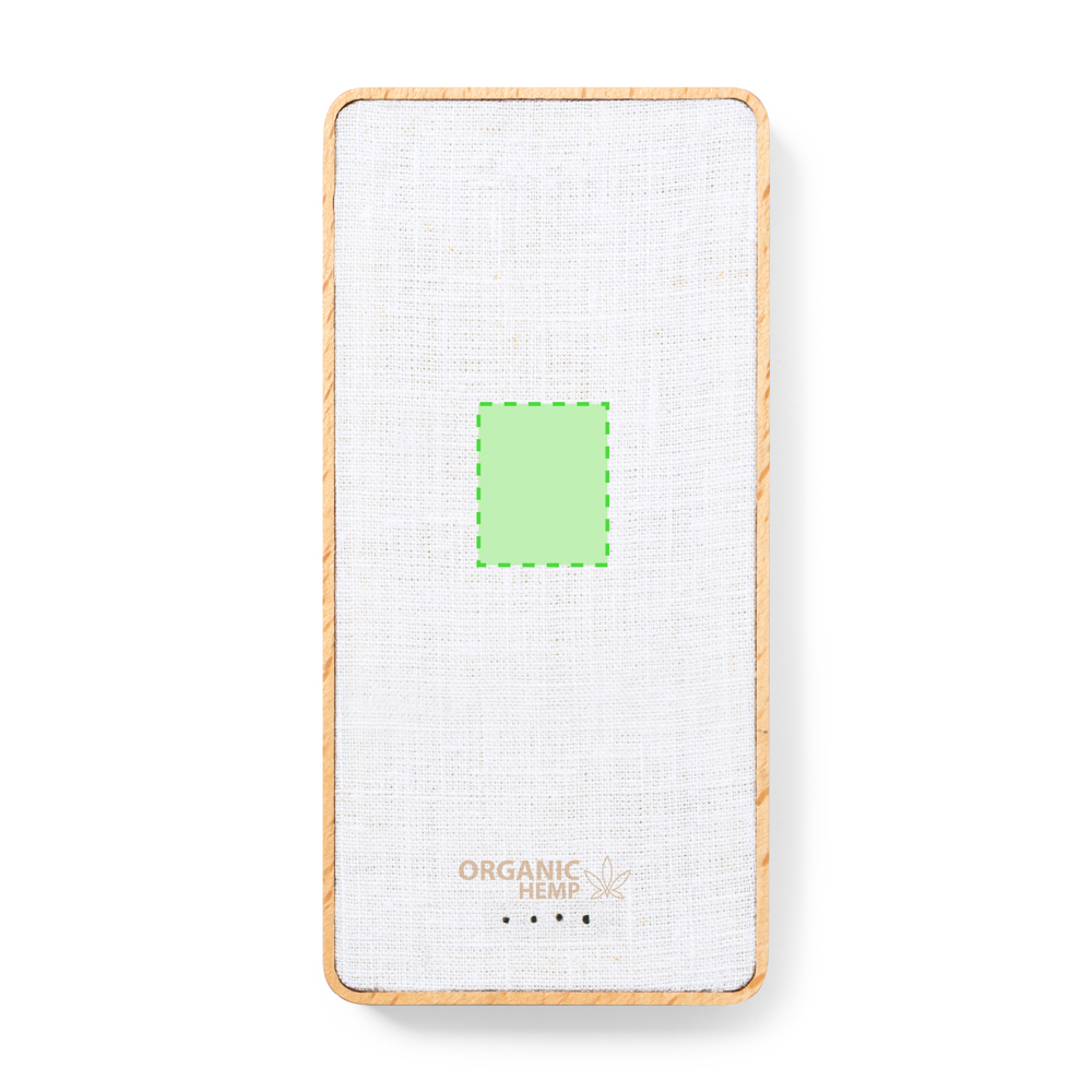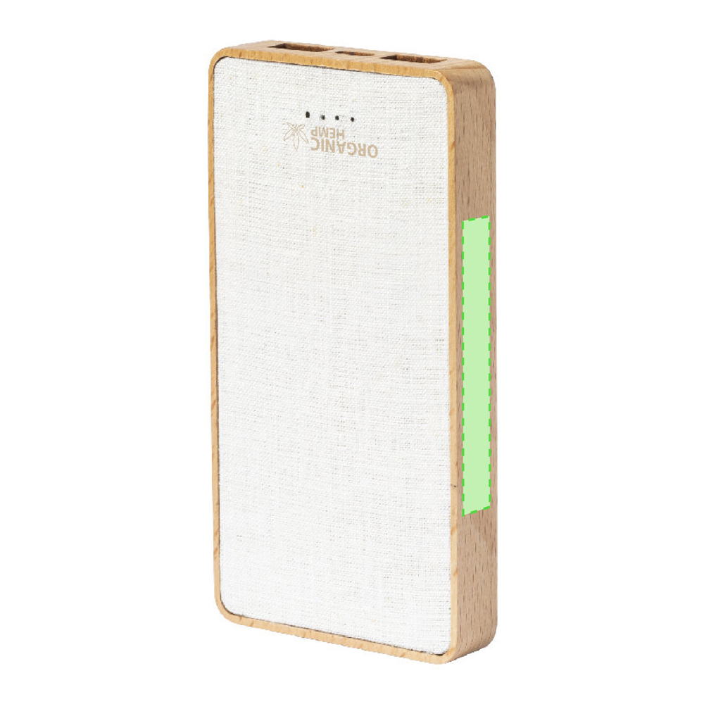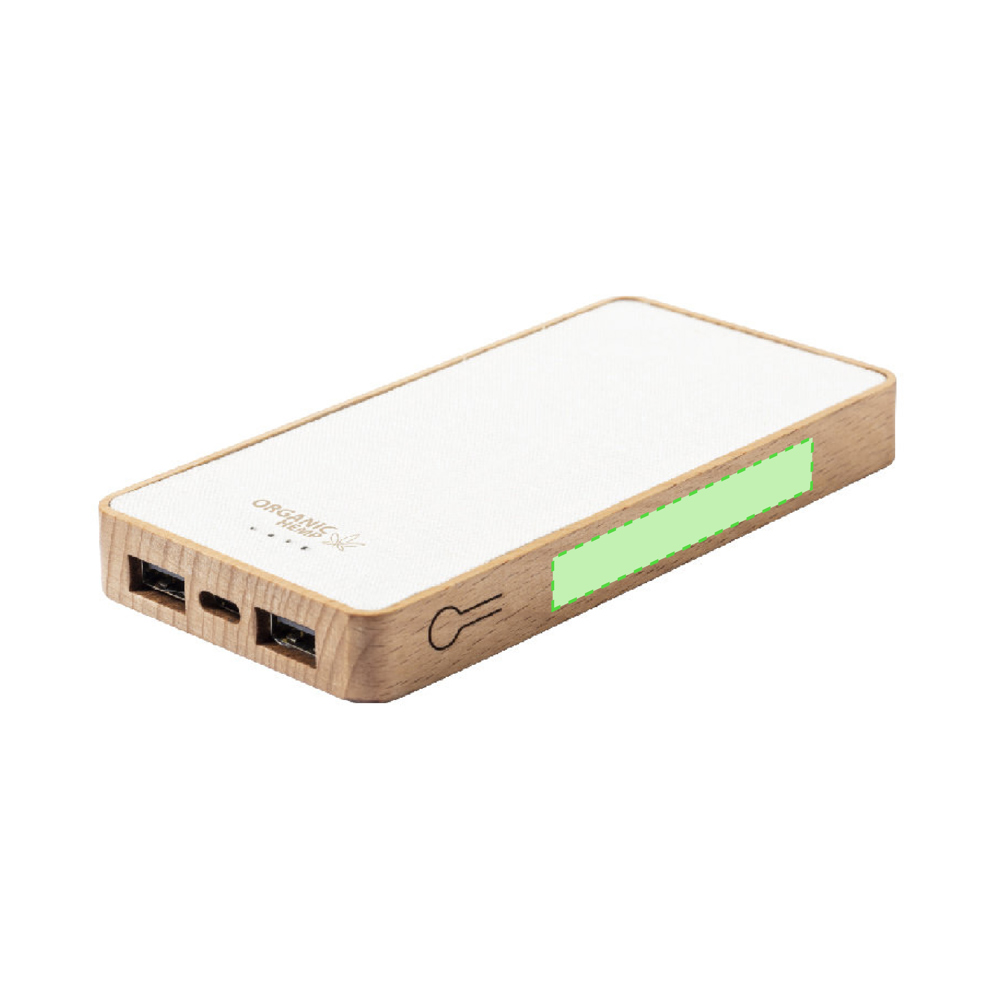 Externer Zusatzakku mit 8.000 mAh. Gehäuse aus einer Kombination aus Bio-Hanf und Naturholz.