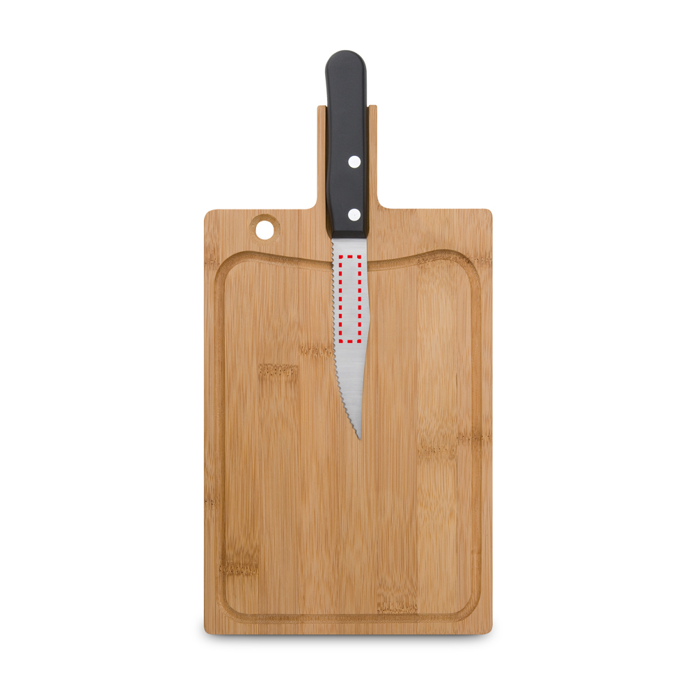 Das Messer wird magnetisch in der Griffmulde des Bambusbretts gehalten – ein echter Hingucker der durch die lange und häufige Nutzung dauerhaften Werbeerfolg garantiert.