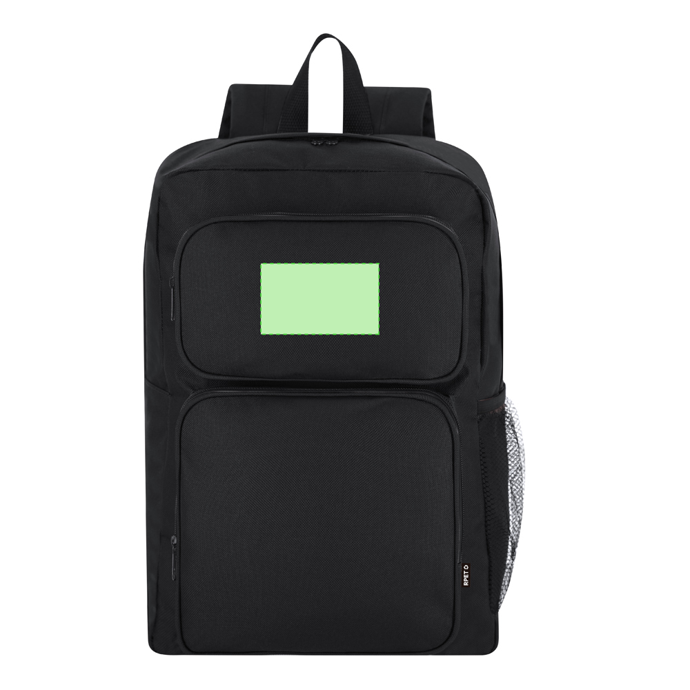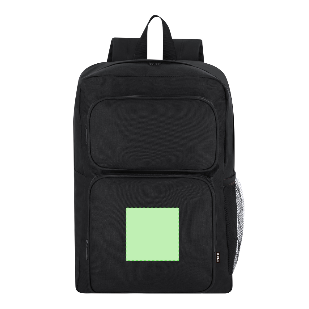 Rucksack aus weichem 600D RPET Polyester. Mit Haupttasche mit Reißverschluss und doppeltem schwarzem Metallzug. Es enthält zwei vordere Taschen mit Reißverschluss und eine Netztasche auf der rechten Seite. Verstellbarer gepolsterter Rücken und Gurte. Mit RPET-Abzeichen auf dem Etikett.