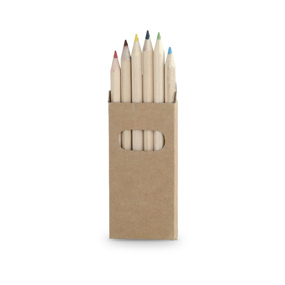 Set aus 6 Buntstiften in einer Schachtel aus Naturkarton mit Fenster. Mit sechseckigem Schaft in Naturfarbe und Minen in verschiedenen Farben.