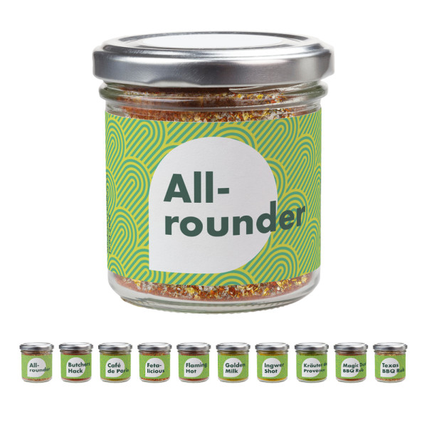 Das Genussglas Midi First ist unser Highlight hochwertiger Gewürzgeschenke. Das wiederverwendbare Glas im Midi-Format wird mit ausgewählten Klassikern befüllt und bietet mit Flaming Hot oder Texas BBQ Rub zwei beliebte, kräftige Geschmacksrichtungen zur Auswahl. Ein individuell gestaltetes 4c-Etikett macht das Glas zu einem klaren Markenbotschafter und sorgt für eine professionelle Präsentation. Durch seine kompakte, wertige Form eignet sich das Glas Midi First ideal als Kundengeschenk, Mitarbeiterpräsent oder als Genussartikel für Events und Aktionen und verbindet Alltagstauglichkeit mit Markenwirkung.