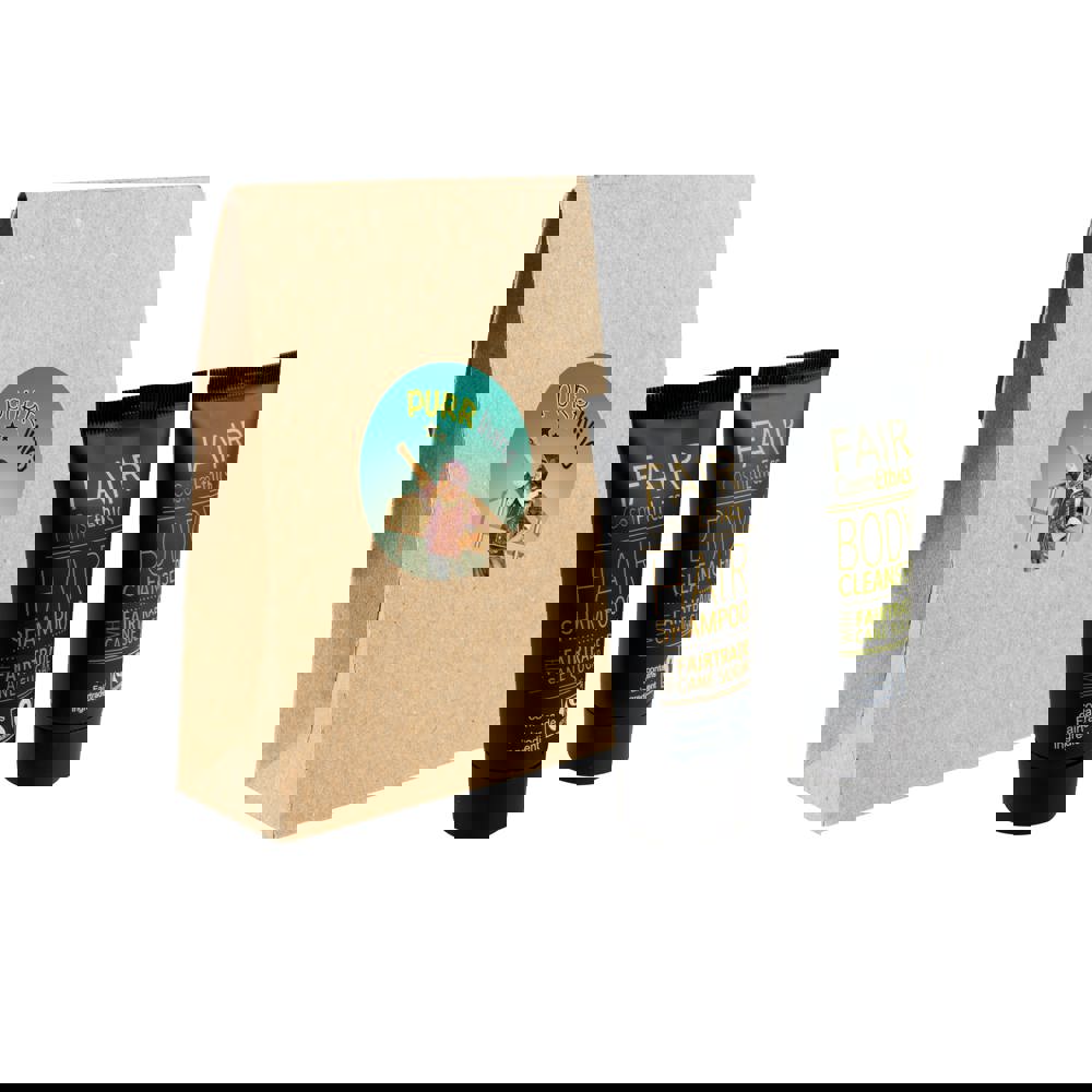 30 ml Duschgel und 30 ml Shampoo in einem Kraftpapierbeutel.