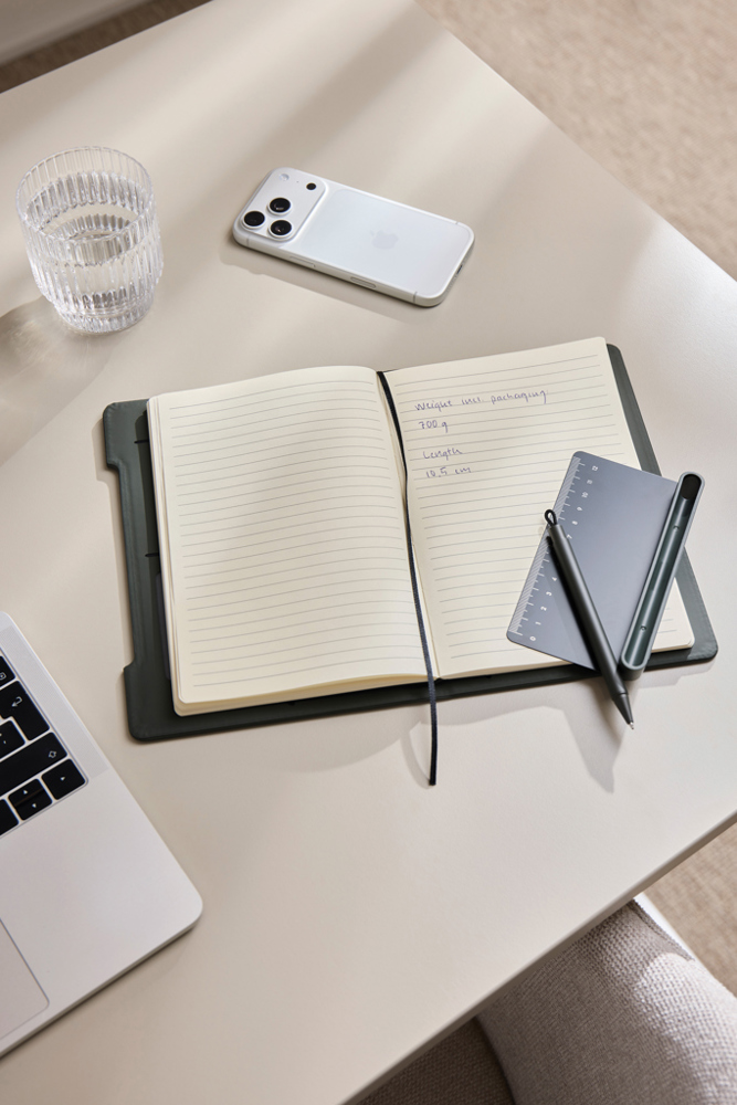 Entdecken Sie das ultimative multifunktionale Notizbuch. Diese intelligente 4-in-1-Lösung vereint Funktionalität, Flexibilität & Design in einem. Hergestellt aus RCS-zertifiziertem Recyclingpapier mit einem Einband in klassisch matter PU-Beschichtung, ist es ebenso optisch ansprechend wie funktional. Ein magnetisches Lineal dient sowohl als Lineal als auch als Stifthalter und enthält einen passenden Kugelschreiber mit blauer Tinte. Der Stifthalter lässt sich leicht in einen in die Struktur des Notizbuchs integrierten Handyhalter verwandeln. Im Inneren befinden sich Kartenhalterklappen und ein leicht austauschbares Notizbuch für langlebigen Gebrauch. Das Notizbuch enthält 80 Blatt / 160 linierte Seiten und bietet viel Platz für Notizen, Planungen und Ideen. Es ist der perfekte Begleiter für Besprechungen, Reisen oder die tägliche Organisation. Gesamtanteil an recyceltem Material: 70% bezogen auf das Gesamtgewicht des Artikels. Zertifiziert durch Control Union, CU1162221.