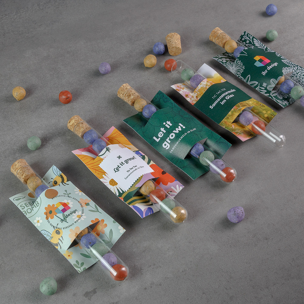 Das Reagenzglas „Tic Tac Toe“ verbindet spielerische Leichtigkeit mit einem echten Wachstumserlebnis. Gefüllt mit zehn kleinen Samenmurmeln aus Erde, Lehm und einem vielfältigen Samenmix enthält jedes Glas insgesamt 19 verschiedene Blumensamenarten. Die Samenmurmeln sind wahlweise einfarbig oder bunt gemischt erhältlich und stehen in den Farben Blau, Gelb, Rot, Violett, Grün oder Natur zur Auswahl. Durch die Verwendung ungiftiger Farben und natürlicher Inhaltsstoffe eignet sich das Produkt auch für den Einsatz in familiennahen Kontexten. Das hochwertige Reagenzglas wird in Deutschland gefertigt und kann mit einem individuell gestalteten Papierfähnchen personalisiert werden. So wird aus einem kleinen Give-away ein sympathischer Werbeartikel, der Freude bereitet und sichtbar aufblüht.