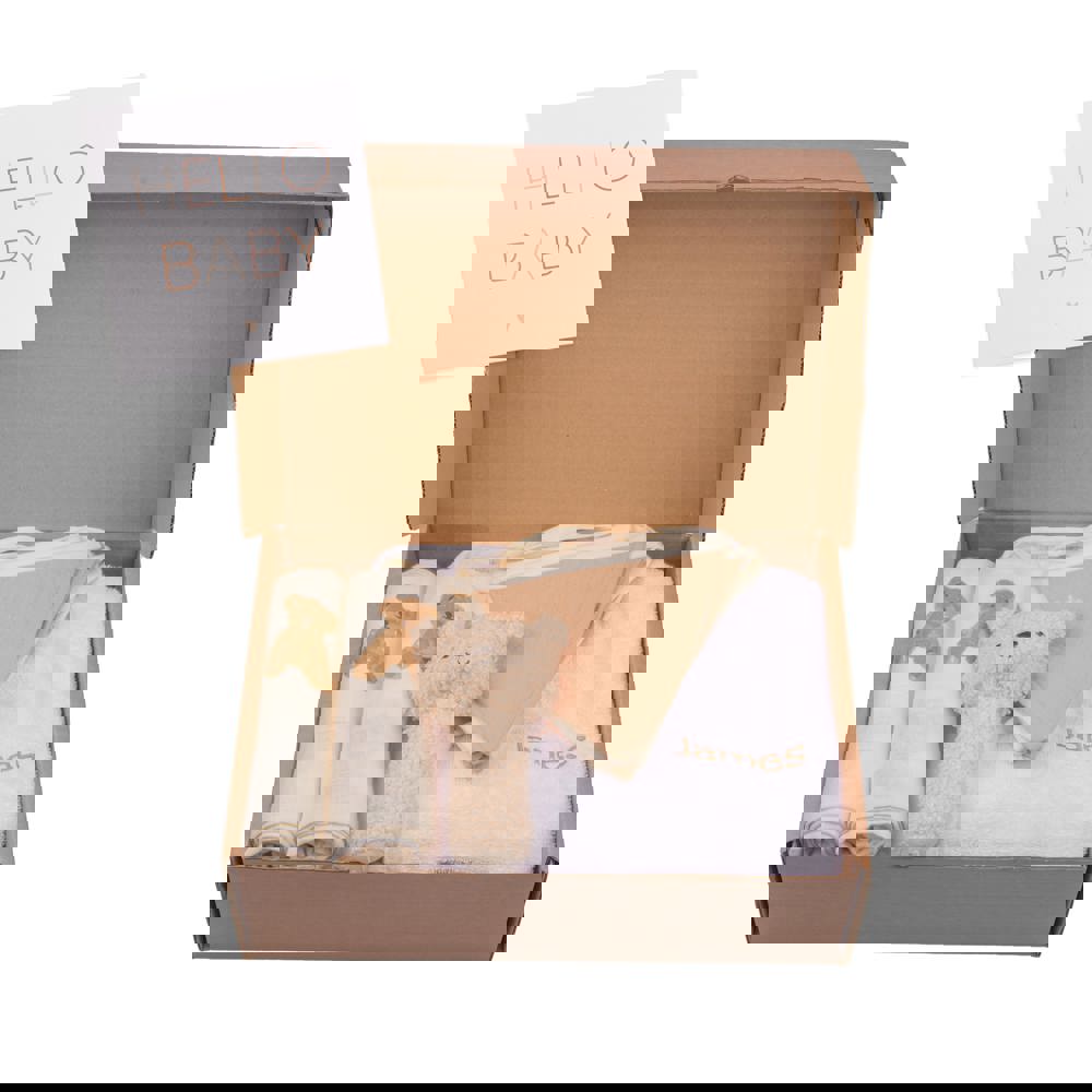 Geburtsgeschenkset L inklusive personalisierte Karte. Enthält ein weißes Bademäntel, ein Teddy Bear Rassel, 2 Teddy Bear Mulltucher Musselin und ein Flaggenleine aus Stoff, verpackt in einer braunen Box mit Hello Baby-Etikett.