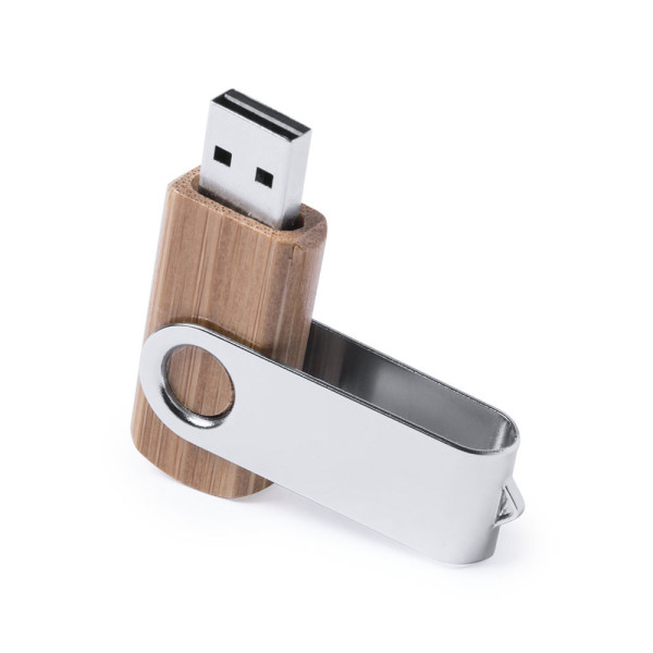 USB-Stick mit 16 GB Kapazität. Gehäuse aus Bambus mit Metallclip und Drehmechanismus. Präsentiert in einer individuellen Schachtel aus Recyclingkarton.