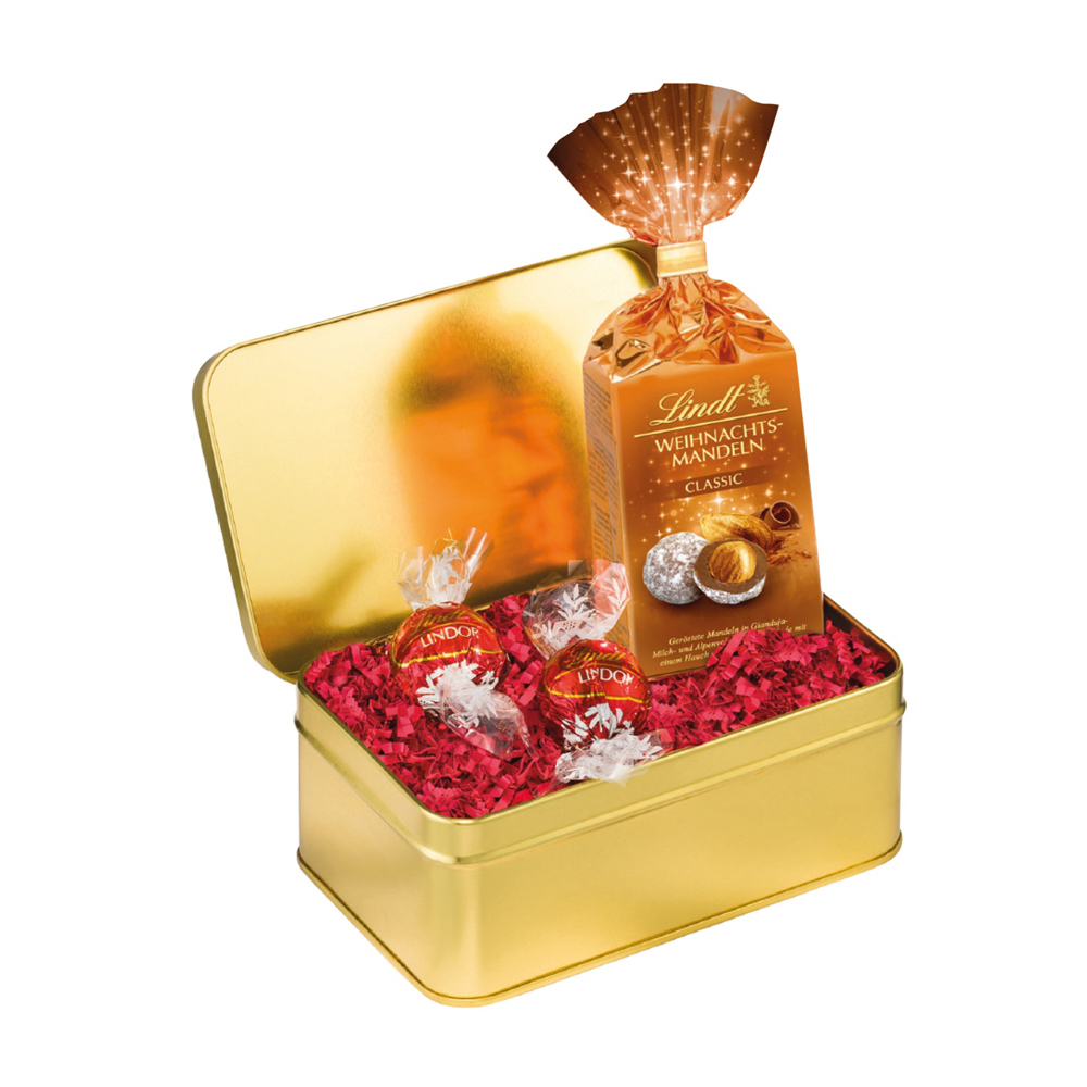 1 hochwertige, goldene Stülpdeckeldose mit rotem Schleifenband, gefüllt mit: 1 Beutel Lindt Weihnachtsmandeln 100 g (geröstete Mandeln in Gianduja Milchschokolade und Vollmilchschokolade) und 2 Lindt Lindor Kugeln je 12,5 g. • Die Goldbox kann mit einem 1c Druck und mit einem 4c Etikett auf dem Deckel oder mit einem 4c Anhänger am Schleifenband veredelt werden.