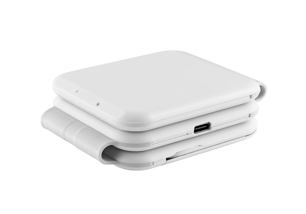 Faltbares sehr kompaktes Ladepad mit 2 Lademöglichkeiten - Wireless charging pad (15 Watt High speed) für Ihr kompatibles Smartphone, 2,5 Watt wireless pad für die Apple® Watch und kompatible Geräte - inkl. Kabel/Steckersatz zum Anschluss wirklich aller Geräte. Good for the Planet, da aus recyceltem ABS Kunststoff (RCS-konformes RABS - Recyclinganteil >20 %) - ideal für Zuhause/Office und die Reise, Craft Paper Box.