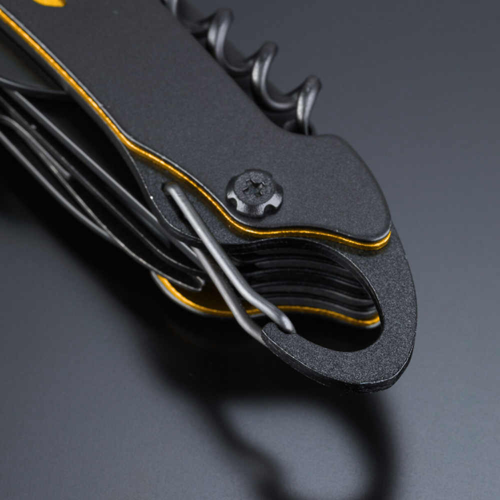 Optima-Taschenmesser im neuen Gewand, hergestellt aus hochwertigem Edelstahl mit Titanbeschichtung für verbesserte Härte und zusätzliche Korrosionsbeständigkeit. Bunte Einsätze am Griff zur dezenten Verzierung. Hauptmerkmale: Schere, Messer, Holzsäge, Flaschen- und Dosenöffner, Fischschaber, Korkenzieher, Locher (zum Durchstechen von z. B. einer Saftdose), Einfädler (zum Flicken von Schläuchen, Nähen von Segelflößen, Flicken eines Reifens), Nagelfeile, Kreuzschlitzschraubendreher. Das Taschenmesser mündet in einen Karabiner, sodass Sie es immer dabei haben können.