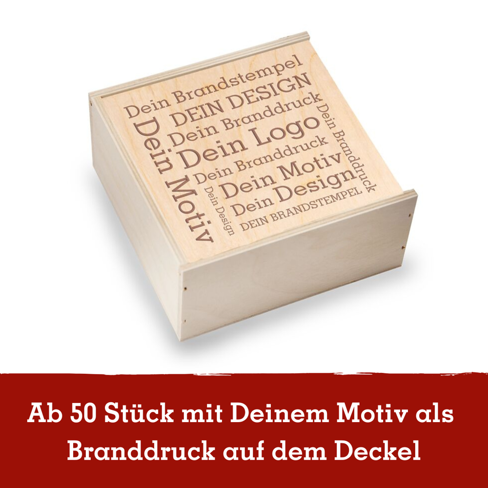Ab 50 Stück mit Ihrem Branddruck auf dem Deckel der Birkenholzbox: Verschenken Sie Gourmet Gewürze mit Premium Zutaten ohne künstliche Zusatzstoffe, 100 % plastikfrei verpackt und mit Liebe konfektioniert in Deutschland. Mit Lebkuchengewürz, Glühweingewürz, Chai Tee, und Haselnusskernen mit Zimt-Vollmilchschokolade. Sie suchen eine andere Größe? Dieses Premium Präsent ist auch mit 2 oder 3 Gläsern erhältlich.