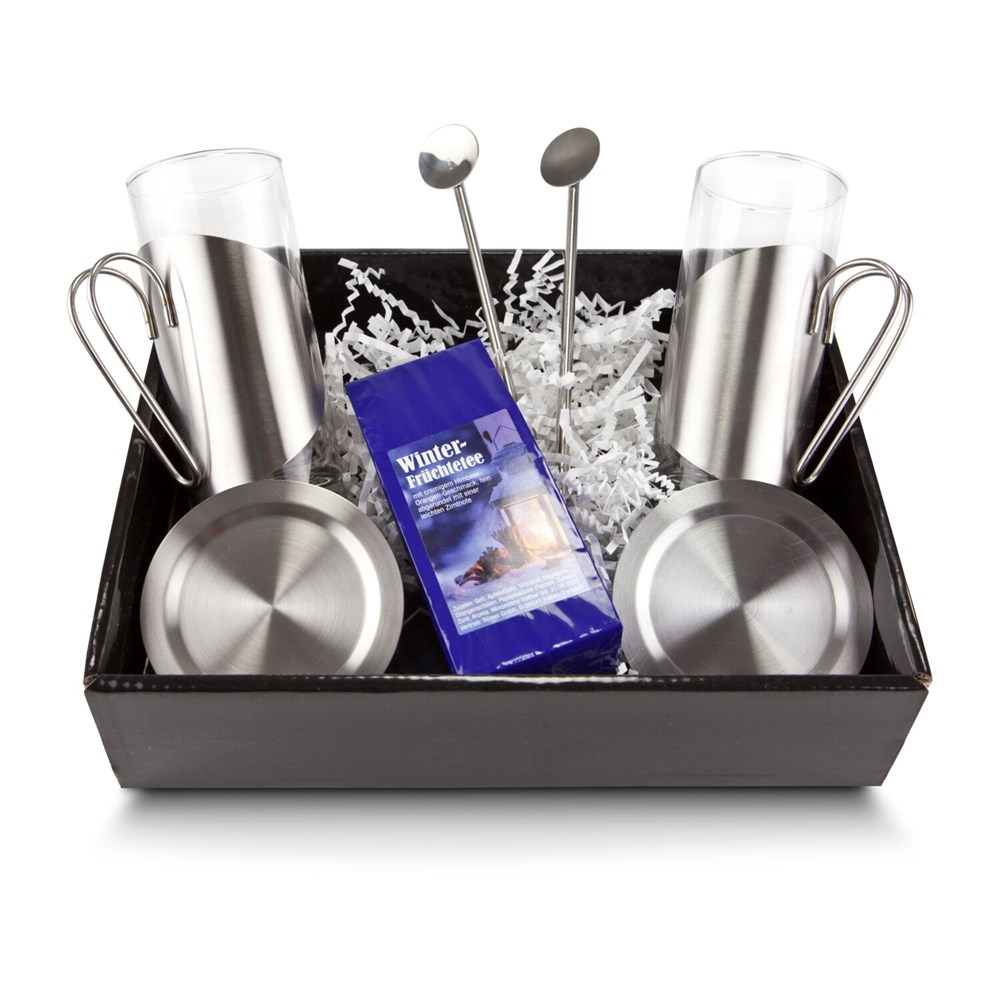 Teegenuss zur Winterzeit! Aus den 2 langen, schlanken Teegläsern (mit Untersetzern und Trinkhalmlöffeln) schmeckt der gleich mitgelieferte Winter-Früchtetee (50 g) besonders gut. Verpackt sind alle Teile in einem schwarzen Karton mit transparentem Deckel und winterlich-weißem Sizzle.