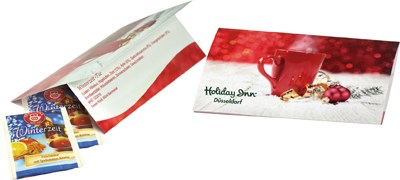 Dieses Klappkärtchen enthält 2 Teebeutel mit Winter-Tee für den besonderen Genuss in der kühlen Jahreszeit. Einfach mal inne halten und sich eine kleine "Tee-Pause" gönnen. Platz für den Werbedruck ist auf dem Standardmotiv des Kärtchens oder eine eigene Gestaltung des Kärtchens, jeweils bereits ab 250 Stück. Inhalt: 2 Teebeutel Winterzeit (je 3 g) Warn- und Sicherheitshinweise: Kinder nicht unbeaufsichtigt am heißen Herd oder mit kochendem Wasser hantieren lassen!