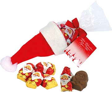 Eine beliebte "Nascherei" zu Weihnachten, schön und originell verpackt. In der Nikolaus-Mütze sind 8 Schokoladen-Weihnachtsmännchen (je 5 g) enthalten. Platz für den Werbedruck ist auf dem Standardmotiv des Anhängekärtchens oder eine eigene Gestaltung, jeweils bereits ab 250 Stück.