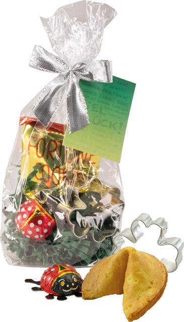 Inhalt: Ausstechform Kleeblatt ca. 5 cm, Schokokäfer (6 g), Glückskeks (6 g)