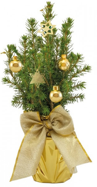 Inhalt: Bäumchen 20-30 cm geschmückt mit 3 goldenen Weihnachtskügelchen, 2 Anhänger Stern (je ca. 3,5 cm), Topffolie gold, Schleife gold