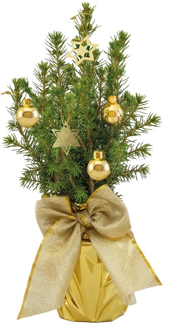 Eine lebende Zuckerhutfichte 20 - 30 cm, verpackt in einer Einzelversandkartonage, als kleines Bäumchen zu Weihnachten. Mit der goldenen Dekoration versetzt diese Zuckerhutfichte jeden Raum in eine weihnachtliche Stimmung. Das Bäumchen kann auf Wunsch von uns direkt an einzelne Empfänger versendet werden. Geschmückt ist das Bäumchen mit 3 goldenen Weihnachtskügelchen und 2 goldenen Sternanhängern. Deko für den Topf: Topffolie gold, Schleife gold. Die Farben Schleifen (rot, orange, blau, gold, silber) und Topffolien (gold, silber) sind beliebig kombinierbar. Ein Werbeeindruck kann auf unserem Anhängekärtchen Artikel 6202 (40 x 60 mm) ab 100 Stück erfolgen oder auf einer Beilage nach Wunsch. Zudem steht als Werbefläche ein separater Schuber, Art.-Nr. 4199-8, zur Verfügung.