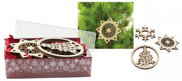 Inhalt: 3 Holzornamente (je Ø 50 mm), 3 Aufhänger
