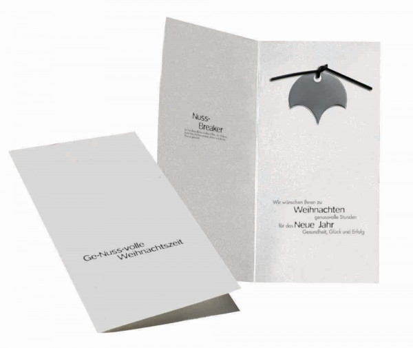 Diese edle Weihnachtskarte enthält einen Edelstahl-Nussbreaker, der in der Winterzeit immer wieder zum Einsatz kommt (ohne Nuss). Platz für den Werbedruck ist auf dem Standardmotiv der Karte oder eine eigene Gestaltung, jeweils ab 100 Stück. Ein Kuvert ist separat erhältlich Art. 6101. Inhalt: Edelstahl Nussbreaker (ohne Nuss)