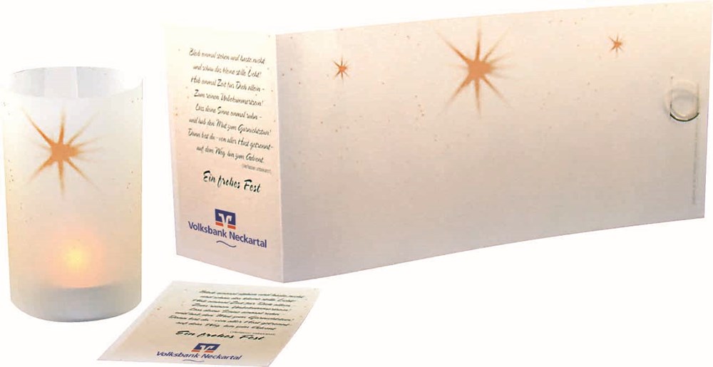 Diese Weihnachtskarte wird nachhaltig genutz. Nach dem Weihnachtsgruß wird sie einfach zusammengerollt und schmückt zusammen mit einem Teelicht jeden Raum (ohne Teelicht). Platz für den Werbedruck ist auf den Standardmotiven der Karte (Grußcoupon und Lichtrollenteil) oder eine eigene Gestaltung der Karte, jeweils ab 100 Stück. Ein Kuvert ist separat erhältlich Art. 6101 Inhalt: Lichtdurchlässige Weihnachtskarte mit Grußcoupon, perforiert (faltbar auf Lang-DIN) mit einer Metallklammer als Halterung für den gerollten Kartenteil (ohne Teelilcht) Warn- und Sicherheitshinweise: Kerze nicht unbeaufsichtigt brennen lassen und auf eine feuerfeste Unterlage stellen.