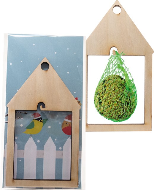 Das Vogelhäuschen aus Holz lässt sich überall aufhängen und mit einem Meisenknödel bestücken. Bald schon können die Vögel bei Ihrem Festmahl beobachtet werden. Die Karte kann mit Ihrem Eindruck versehen oder, ebenfalls ab 250 Stück, individuell gestaltet werden.