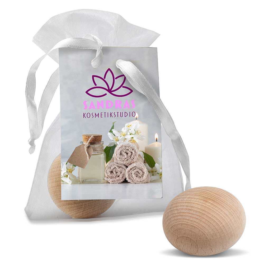 Der Handschmeichler aus unbehandeltem Holz verspricht Ruhe, Entspannung und ein angenehmes Gefühl. Mit seiner glatten Oberfläche, den weichen Kanten und seiner interessanten Form bietet er spielerisch ein angenehmes und zugleich(ent)spannendes Tasterlebnis. Eine optionale Lasergravur sorgt für bleibende Werbung. Geliefert im Organzasäckchen mit einem angebrachten Hangtag, welcher auf der Vorder- und Rückseite individuell gestaltet werden kann.