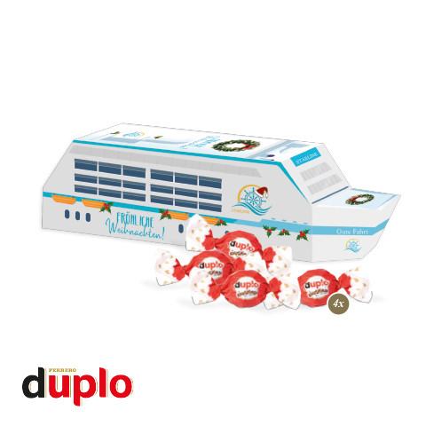 Ideales Weihnachtspräsent mit eigenem Motiv! Die auffälligen 3D Präsente „Weihnachtshaus“, „Bus“, "Schiff" oder „Container“ sind als individuelles Weihnachtspräsent für Kunden und Mitarbeiter schwer beliebt. Rundum nach Ihren Wünschen bedruckbar und mit feiner Markenschokolade befüllt, sind diese ein echtes Highlight. Produktdetails: Individuelle Präsentverpackung aus hochwertiger Kartonage mit süßer Füllung. Nachhaltigkeit: Wir verwenden FSC®-zertifizierten Karton aus nachhaltiger Forstwirtschaft und anderen kontrollierten Quellen.