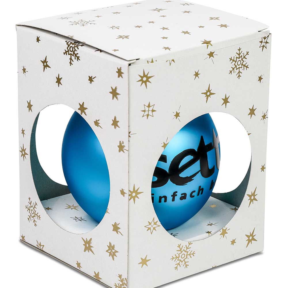 Gibt es etwas Schöneres, als wenn sich das Kerzenlicht in einer Glaskugel spiegelt? Die formschönen, mundgeblasenen und handdekorierten Glaskugeln werden in Tschechien hergestellt und bereits ab 250 Stück individuell bedruckt. Der einfarbige Druck wird in einer Kombination von Siebdruck und Handarbeit auf die Glaskugel aufgebracht. Zum Aufhängen der 8 cm großen Kugel ist eine Öse (wahlweise in Alu-Natur oder Goldfarben) befestigt.