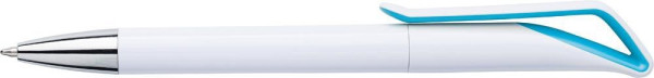 Drehkugelschreiber aus Kunststoff, mit farbigen Akzenten und blauer Mine.