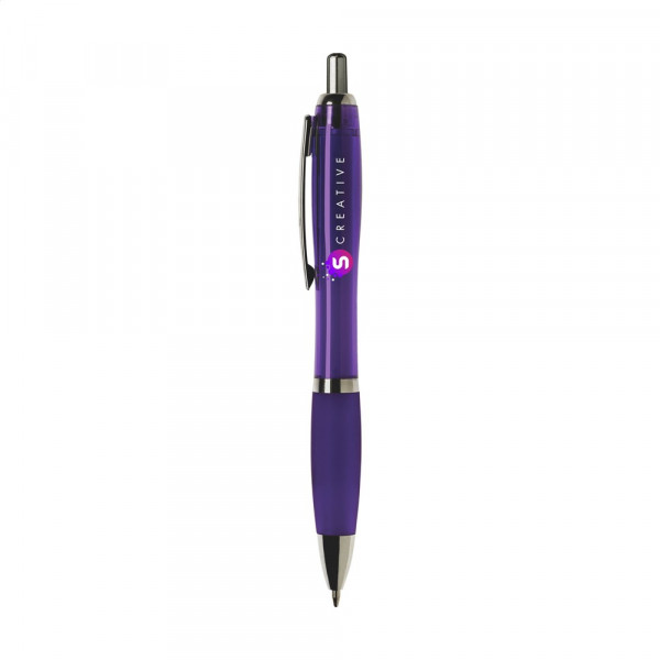 Blauschreibender oder schwarzschreibender Kugelschreiber mit transparentfarbener Gehäuse, grifffestem Vorderteil und Metallclip.