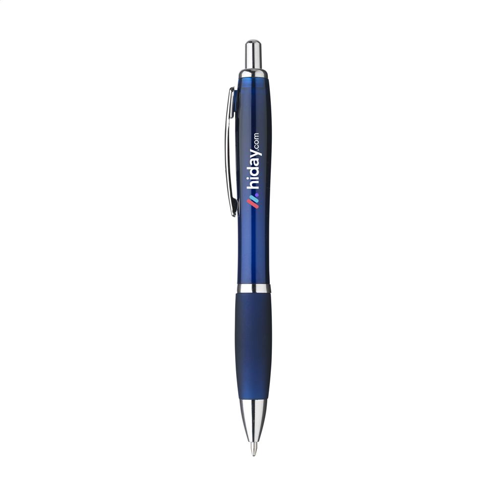 Blauschreibender oder schwarzschreibender Kugelschreiber mit transparentfarbener Gehäuse, grifffestem Vorderteil und Metallclip.