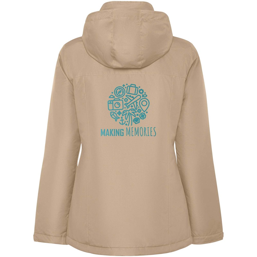 Wasserabweisende, wattierte Parkajacke für Damen. Schlanke Passform. Hoher Kragen mit einrollbarer und abnehmbarer Kapuze mit Klettverschluss. Mittig durchgehender Reißverschluss mit Patte. Seitentaschen mit Reißverschluss und fester Patte. Innentasche mit Klettverschluss. Verstellbare Ärmelbündchen mit Klettverschluss. Verstärkungen im Rücken und auf der linken Brust.