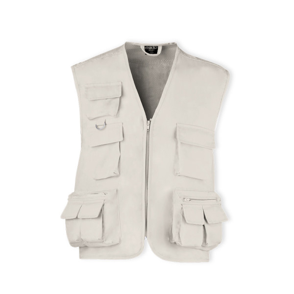 Weste aus einer resistenten Baumwoll/Polyester-Kombination in kräftigen Farben. Mit Reißverschluss, mehreren Vorder- und Seitentaschen mit großem Fassungsvermögen und Klettverschluss sowie Metallring auf der Brust. Erhältlich in den Größen L, XL und XXL.