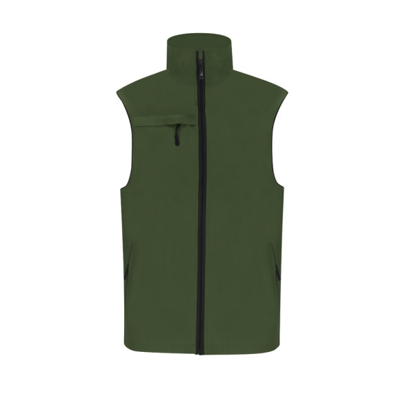 Unisex-Weste aus leichtem, atmungsaktivem Stoff mit weißem Mesh-Futter. Schwarzer Frontreißverschluss und silberner Zipper. Einschließlich einer Außentasche auf der rechten Brust und zwei Seitentaschen mit schwarzen Reißverschlüssen und Zugern. Mit einem Halbmond auf der Innenseite des Kragens.