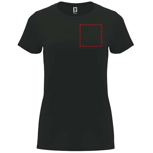 Tailliertes kurzärmeliges T-Shirt für Damen. Rundhalsausschnitt mit 1×1 Rippstrick. Verstärkte und verdeckte Nähte am Kragen. Herausnehmbares Etikett.