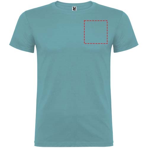 Kurzärmeliges T-Shirt mit doppellagigem Rundhalsausschnitt aus Elasthan, hergestellt aus schlauchförmigem Material für Erwachsene. Verstärkte und verdeckte Nähte am Kragen. Herausnehmbares Etikett. Das Modell ist 190 cm groß und trägt Größe L.