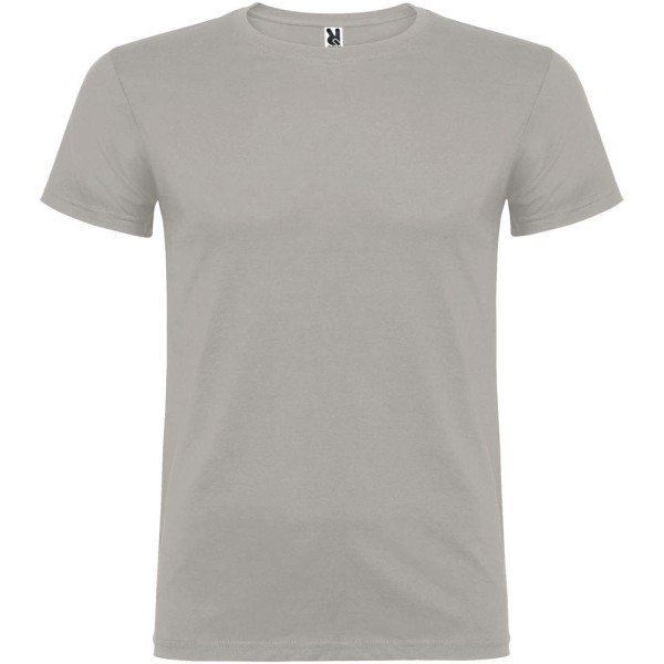 Kurzärmeliges T-Shirt mit doppellagigem Rundhalsausschnitt aus Elasthan, hergestellt aus schlauchförmigem Material für Erwachsene. Verstärkte und verdeckte Nähte am Kragen. Herausnehmbares Etikett. Das Modell ist 190 cm groß und trägt Größe L.